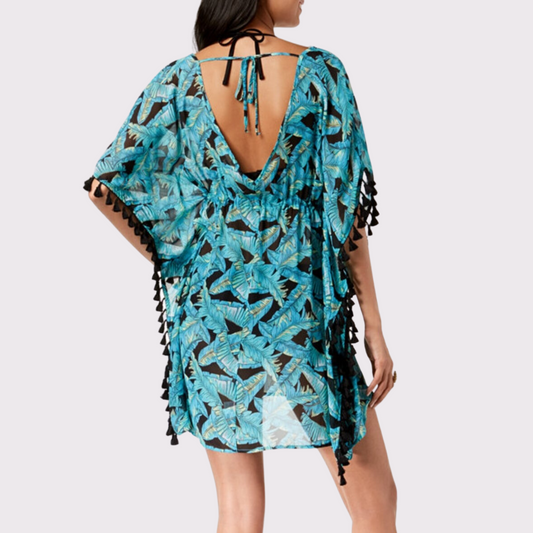 غطاء تونيك بطبعة أوراق الشجر على شكل حرف V مع شراشيب