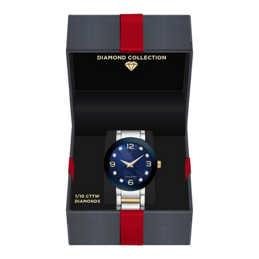 ساعة بسوار من الفولاذ المقاوم للصدأ بلونين مزينة بقوس أحمر وماس